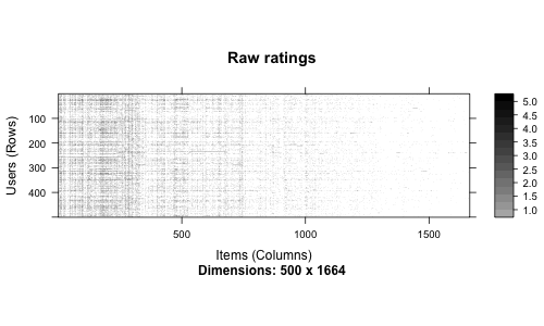| image(sample(MovieLense, 500), main = "Raw ratings") | |