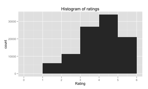 | main = "Histogram of ratings", xlab = "Rating") | |